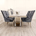 The velvet armchairs are enhanced with a quilted back, chrome lion head knocker and chrome legs making them a show stopping addition to a modern dining space.